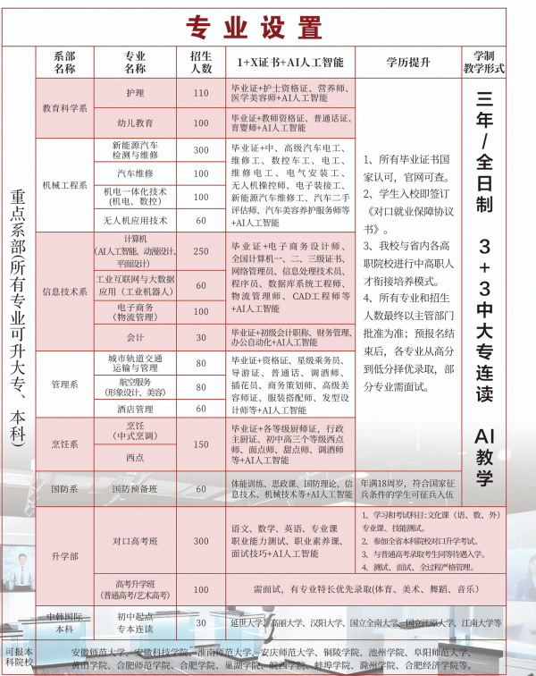 合肥高科经济技工学校坐落于合肥市新坐区岱河682号,地铁3号线文浍苑坐A口中转,地处从城焦点区域,交通便利,周边财产配套完美。学校占地300余亩,采用园林式结构,集职业教育、技术培训、技术判定及就业办事于一体,是安徽省沉点技工院校。自开办以来,学校一直“厚德强技、经世致用”的校训,苦守“以市场为导向、以道德为根本、以技术为焦点、以成长为底子”的办学,建立了“产教融合、工学一体”的特色办学系统,努力于培育德技双馨的中高级使用型人才。详情请征询招生办窦教员。应届、往届初中结业生:春秋14 - 18周岁(2026年9月1日前满14周岁),持有初中结业证书(应届生可凭结业证名),操行规矩、身心健康,无不良嗜好及传染性疾病,通过学校分析素养面试即可登科。学校不将中考绩绩做为焦点登科根据,更沉视学生的进修志愿取职业潜力。社会青年及停学者:春秋16 - 22周岁的高中停学生、社会退职人员,有提拔学历取专业技术需求者,凭身份证及相关证明材料报名,经分析评估及格后纳入培育系统。特殊群体及跨区域考生:退役甲士、企业职工等春秋可恰当放宽,凭相关证件享受国度专项帮学政策取审核绿色通道;非安徽省户籍考生无需额外供给社保、栖身证明,凭身份证及结业证即可打点报名手续。学校聚焦现代财产人才需求,开设七大系部16个特色专业,所有专业均配套“1 + X证书 + AI技术认证”培育系统,设置中级工(3年)、高级工(5年)学制,且全数开通“3 + 3”中大专连读通道,取省内多所优良高职院校实现学分互认、无缝跟尾。具体专业引见如下:新能源汽车检测取维修(订单班):对接蔚来汽车订单培育,打算招生120人,实操课程占比超65%,可考取汽车维修工、高级电工证,结业后优先入职合做车企。机电一体化手艺:培育具备机械设想、电气节制、从动化设备能力的人才,焦点课程包罗机械制图、电工电子手艺、PLC节制手艺。无人机使用手艺:跟着无人机正在农业、测绘、物流等范畴的普遍使用,该专业培育控制无人机拆卸、调试、飞翔操做及调养等技术的专业人才。计较机使用(AI人工智能标的目的):取科大讯飞共建实训核心,融入华为HCIA认证培训,侧沉软件开辟取AI使用,适配数字财产人才需求。工业互联网取大数据使用:培育处置工业互联网设备安拆、调试取,以及大数据采集、阐发、处置等工做的人才,焦点课程包罗传感器手艺、无线收集、数字手艺:涵盖平面设想、动漫设想、短视频制做等范畴,培育具备数字内容创做取能力的专业人才。护理:可考资历证、康养师证,培育控制根本医学、护理手艺等学问和技术,能正在各级各类医疗卫朝气构处置护理工做的专业人才。长儿教育:打算招生80人,前3年夯实学前教育根本,考取保育员证书,大专阶段跟尾学前教育专业,结业后可报考教师资历证,对接公办、平易近办长儿园就业。电子商务取曲播运营:取合肥剧兴收集科技共建新财产学院,开展实正在曲播项目实操,大专阶段对接跨境电商专业,适配数字经济成长趋向。会计电算化:培育熟练使用财政软件、具备企业会计核算能力的人才,焦点课程包罗财政会计、税务实务、财政软件使用。旅逛取酒店办理:培育具备导逛办事、酒店运营、会展筹谋能力的人才,焦点课程包罗旅逛地舆、酒店办理、会展筹谋。航空办事:需通过根本抽象气质审核,培育具备航空办事礼节、客舱办事技术等学问和技术,能正在航空公司、机场等单元处置航空办事工做的专业人才。中式烹饪:依托校内烹调大师工做室讲授,可考取品级厨师证,结业后可入职星级酒店或自从创业,适合餐饮行业快乐喜爱者。西点制做:培育控制西点制做工艺、烘焙手艺等学问和技术,能正在烘焙店、酒店等场合处置西点制做工做的专业人才。升学部:开设对口高考班、艺术高考升学班,专为意向冲刺大专、本科的学子设立,配备专职教师定制备考方案。