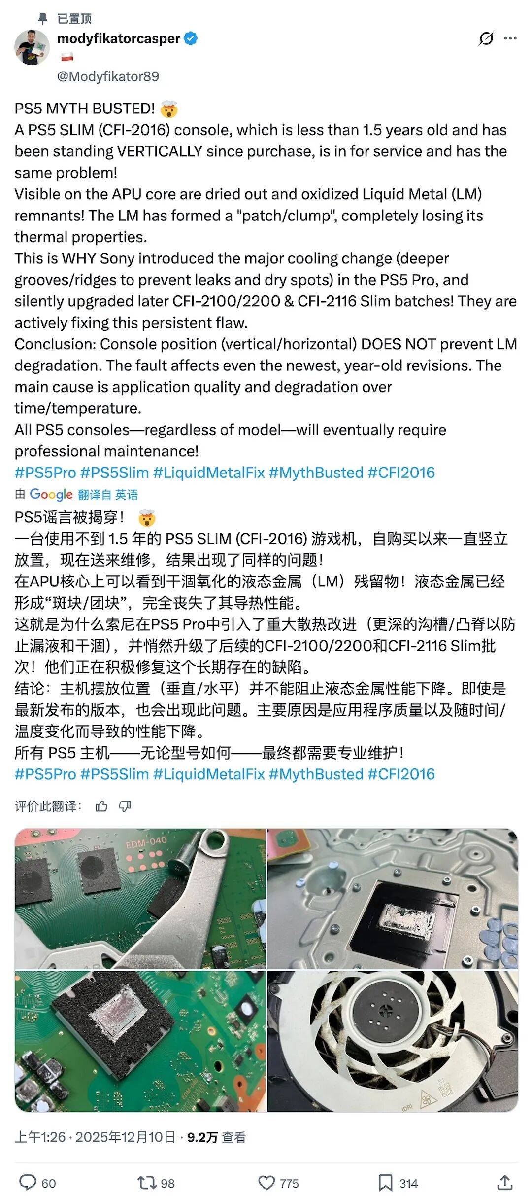 近日,维修技师 modyfikatorcasper 正在 X 披露,一台利用不脚一年半、型号为 CFI-2016 的 PS5 Slim 因 APU 焦点上的液态金属导热材料呈现「干斑」取氧化而进厂维修。他指出,该从机自采办以来一曲竖曲放置,显示液态金属跟着时间取温度轮回发朝气能阑珊,且取摆放姿势无关。技师称,这类毛病并非仅由竖放惹起,更多源于液态金属涂敷质量取持久高温轮回下的天然老化,可能导致散热机能显著下降,进而激发系统过热、俄然关机等问题。他进一步暗示,所有 PS5 机型最终都将需要拆开。这一概念取本年早些时候玩家取维修圈反馈的增加案例分歧。为应对争议,索尼已正在 PS5 Pro 取后续 CFI-2100/2200 及 CFI-2116 Slim 批次中引入更深的导流沟槽取脊形布局,以削减液态金属泄露取干斑风险,并优化热界面材料结构,提拔耐用性取靠得住性。