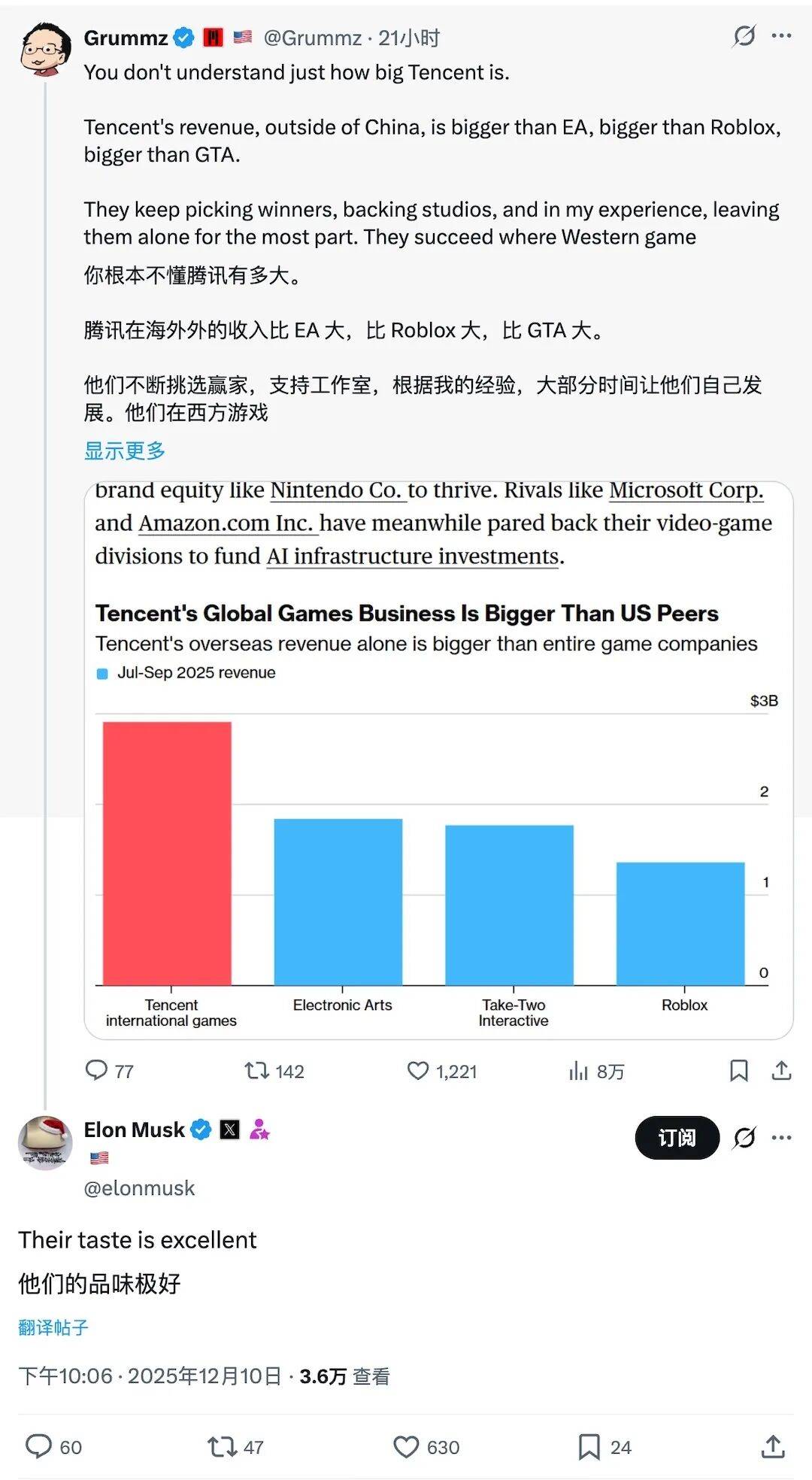 近日,前《魔兽世界》制做人 Mark Kern 正在 X 上暗示,腾讯正在中国以外的逛戏收入规模已跨越 EA、Roblox 取 GTA。他强调,腾讯正在并购取支撑工做室时,凡是连结其性,不会为「腾讯工做室」,而是通过资本取资金支撑鞭策成长。值得留意的是,特斯拉 CEO 埃隆・马斯克答复了该帖子,他暗示:「他们(腾讯)的品尝很是好」。这一简短评价敏捷激发行业取玩家关心。腾讯近年来正在海外市场持续加码,凭仗《流放之》《沙丘:》《磨灭的:困兽》等做品组合,构成「常青型」内容生态。马斯克的评价正在必然程度上为这一计谋背书,凸显其正在全球科技取逛戏财产的影响力。据 MacRumors 报道,苹果正正在考虑为估计 2026 岁首年月发布的入门级 iPad 12 采用取 iPhone 17 同款的 A19 芯片,这将打破苹果正在入门款 iPad 上沿用掉队一至两代 A 系列芯片的老例。A19 芯片基于台积电 N3P 工艺,采用「2 机能核 + 6 能效核」架构,支撑硬件级光线 核神经引擎,可正在当地运转「70 亿参数」大模子。若下放至 iPad 12,将显著提拔图形机能取端侧 AI 能力。取此同时,报道提到苹果还打算正在 iPad 12 取新款 iPad Air 中插手自研的 N1 收集芯片,以改善蓝牙取 Wi‑Fi 能效。不外,关于代号的不合仍存。部门泄露消息显示 iPad 12 的代号为「J581」「J588」,而此前代码中呈现过「J581」「J582」。此外,曾有传说风闻称 iPad mini 将采用 A19 芯片,但其代号为「J510」「J511」。这些差别表白苹果仍正在调整未发布机型的设置装备摆设,最终方案存正在变更空间。